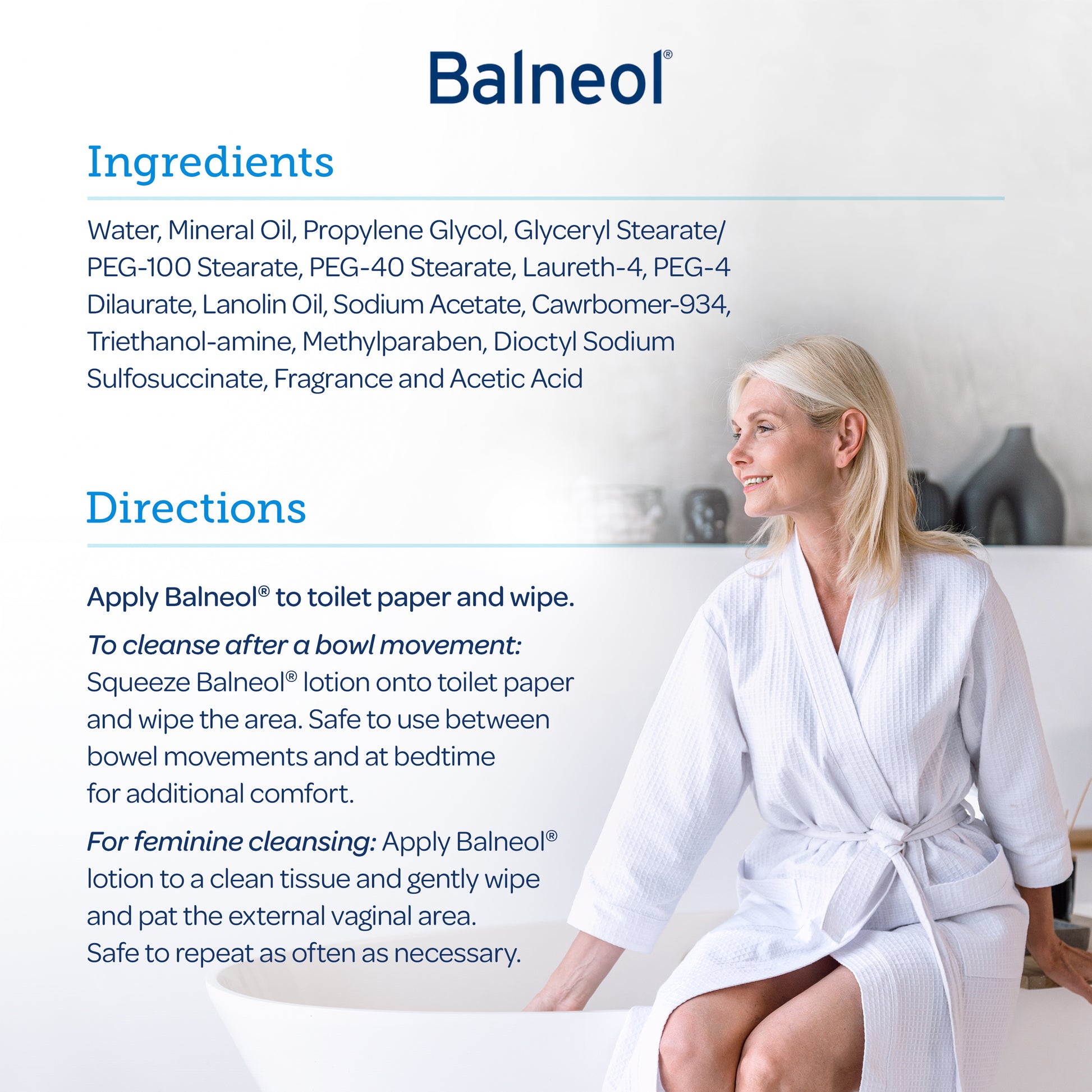 For feminine cleansing: Apply Balneol® lotion to a clean tissue and gently wipe and pat the external vaginal area. Safe to repeat as often as necessary.
